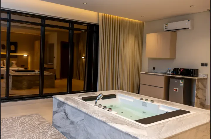 A carefully designed bridal suite to offer you an atmosphere of luxury and romance. The suite features a spacious room with a king-size bed, bathroom, and jacuzzi, and includes a private outdoor seating area that provides you with quiet moments and a distinctive view.